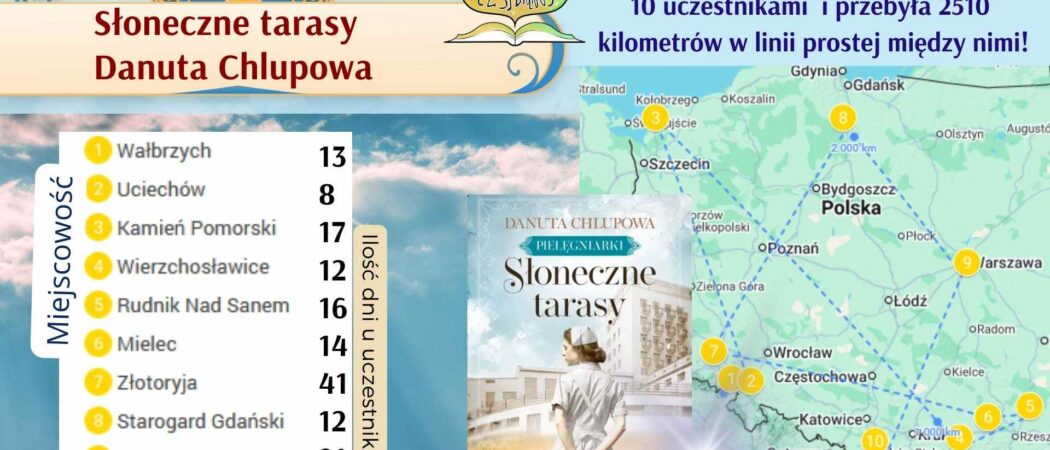 Podsumowanie Książka „Słoneczne tarasy” Danuty Chlupowej przemierzyła Polskę wzdłuż i wszerz, o czym możecie przekonać się spoglądając na powyższą grafikę. Liczne komentarze i zaznaczenia w książce oraz napisane opinie utwierdzają nas w przekonaniu, że nie można było obojętnie przejść wobec tej książki. Średnia ocen w book tour wyniosła 8,33. Uważamy, że jest to bardzo wysoka nota, a każda z uczestniczek znalazła coś dla siebie. Z przyjemnością wyszukiwałyśmy...