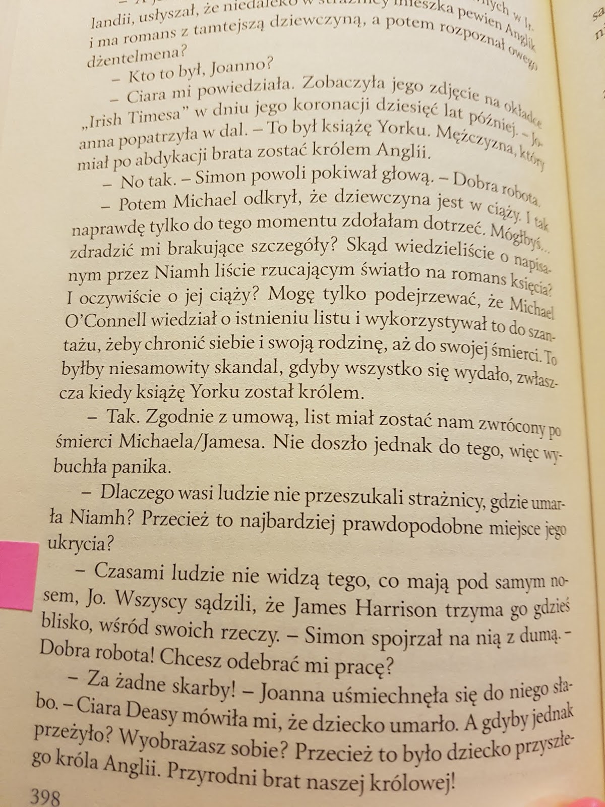 Należy przyznać, że bohaterowie są wielobarwni, jak każdy z nas posiadają wady i zalety. Niektórzy wbrew okolicznościom strają się postępować etycznie, inni za kilka srebrników są gotowi sprzedać przyjaciela czy członka rodziny. Nie polubiłam Arta, który jak dla mnie jest osobą pozbawioną empatii. Wykorzystujący swoją pozycję społeczną, nie szanuje ludzi, którzy są niżej w hierarchii społecznej. Z pewnością nie jest to książka, która nudzi. Czytając o perypetiach Joanny mamy znakomitą okazję, aby razem z nią rozwikłać zagadkę tajemniczego listu. Nie jest to proste, gdyż natrafimy na wiele fałszywych tropów. Poznamy blaski i cienie życia mieszkańców Pałacu Buckingham.