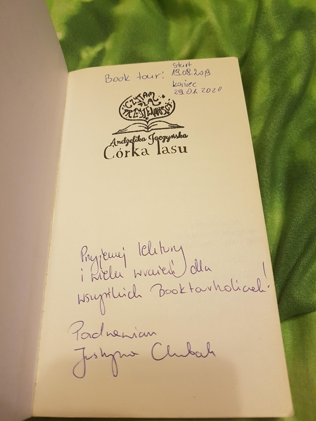 Oficjalnie ogłaszam, że book tour z „Córką lasu” Justyny Chrobak zakończył się. Książka wyruszyła w podróż 19 sierpnia 2019 r. a wróciła do mnie 29 stycznia 2020 r. Jak łatwo obliczyć, jej wędrówka trwała 5 miesięcy i 20 dni. W book tour udział wzięło 10 osób. Dziewczyny bardzo szybko przeczytały książkę, średnio każda z nich była w posiadaniu „Córki lasu” przez 14 dni, bo trzeba doliczyć czas na przesłanie książki dalej. Jestem z was dumna, że jesteście tak sumienne. Każda z was zamieściła opinię za co bardzo wam dziękuję.