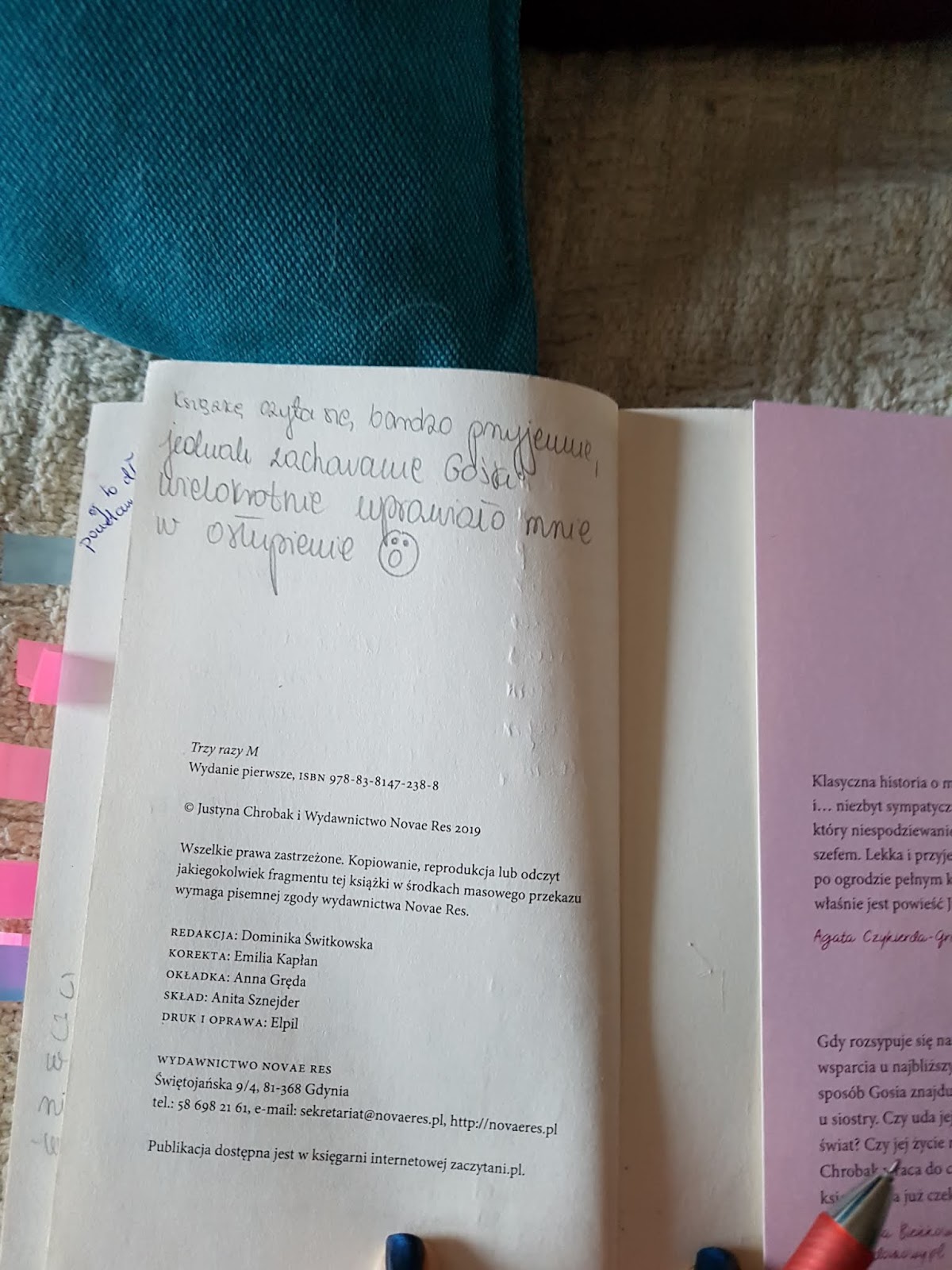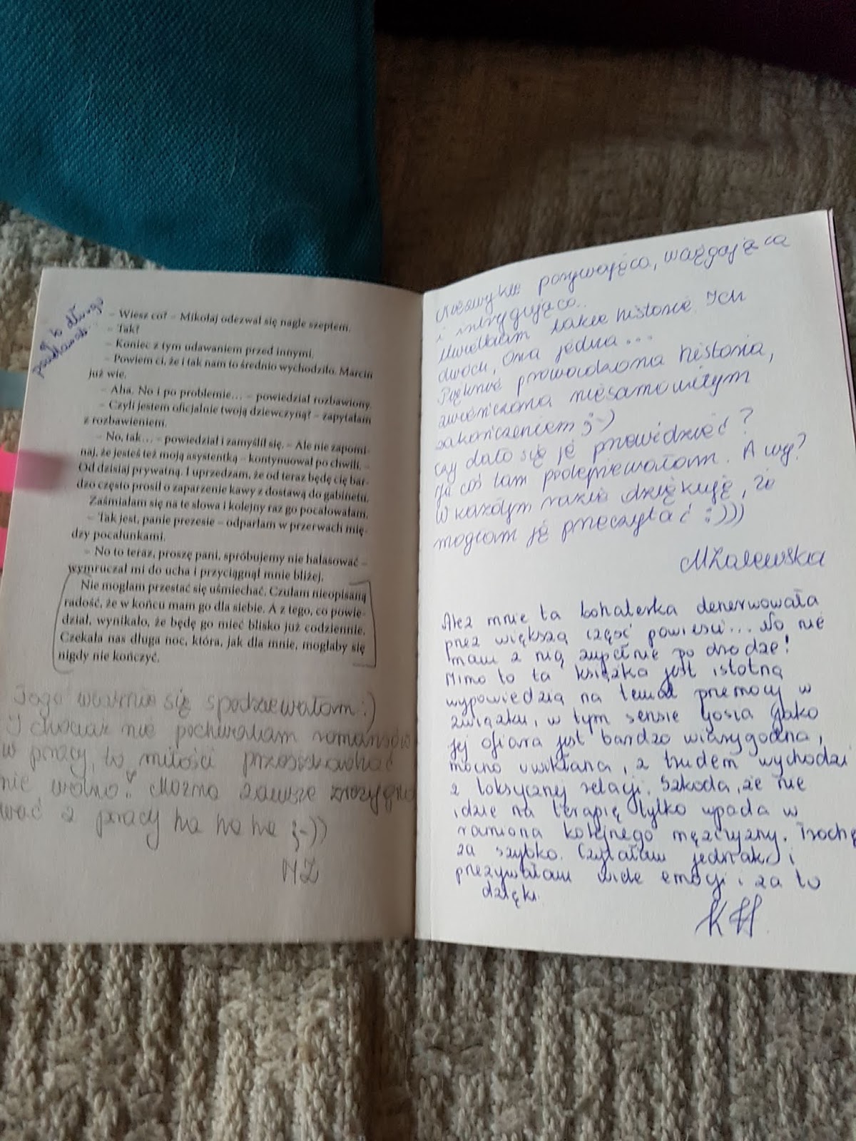 Przeglądając książkę natrafiłam na liczne komentarze, zaznaczenia tekstu oraz wpisy uczestniczek. Jest to bardzo miłe, ponieważ wiem, że powieść była czytana i wywołała mnóstwo emocji wśród czytelniczek.