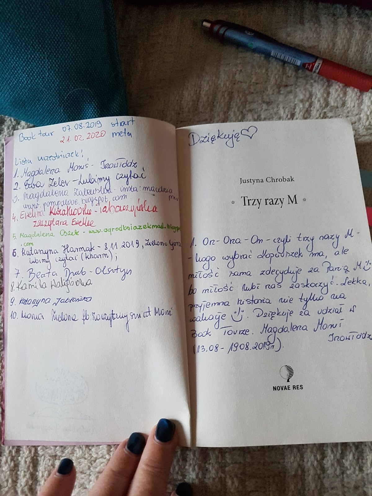 „Trzy razy M” Justyny Chrobok wyruszyła w podróż 7 sierpnia 2019 r. i powróciła do mnie po 6 miesiącach i 14 dniach tj. 21 lutego 2020 r. Jest to świetny wynik book touru, ponieważ odwiedziła 12 miłośniczek czytania. Czeka ją jeszcze jedna podróż do Autorki.