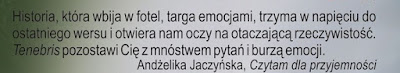 Choć nie przepadam za kryminałami, jednak pewnie skuszę się kiedyś na "Tenebris". Wyjątkowo podoba mi się okładka. Fajna rekomendacja na niej. Gratulacje patronatu.