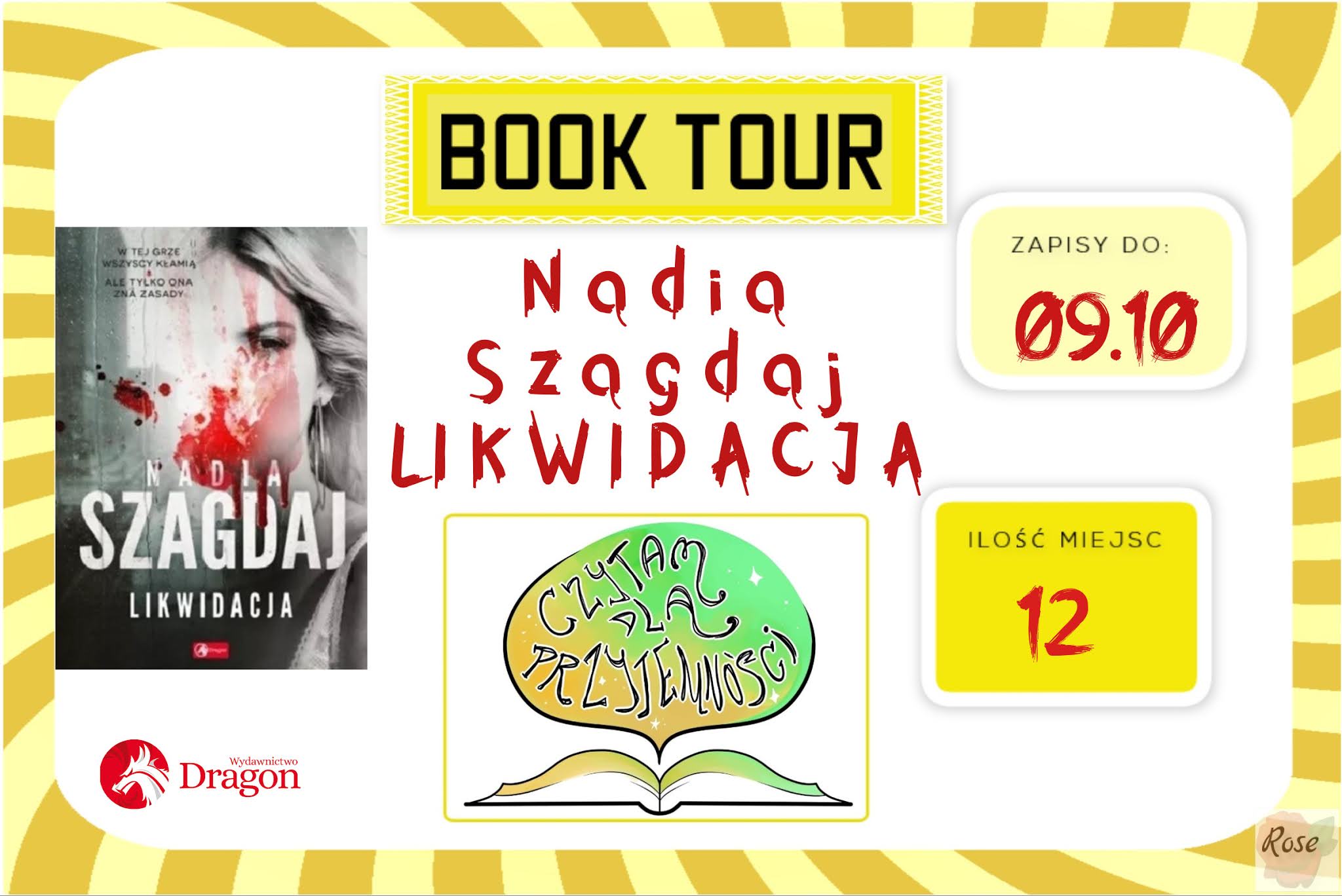 3. Proszę o zdjęcie książki i link do recenzji wysłany za pomocą messenger w grupie BT Likwidacja oraz zamieszczenie w recenzji informacji, że book tour jest organizowany przez Czytam dla przyjemności oraz Nadię Szagdaj.