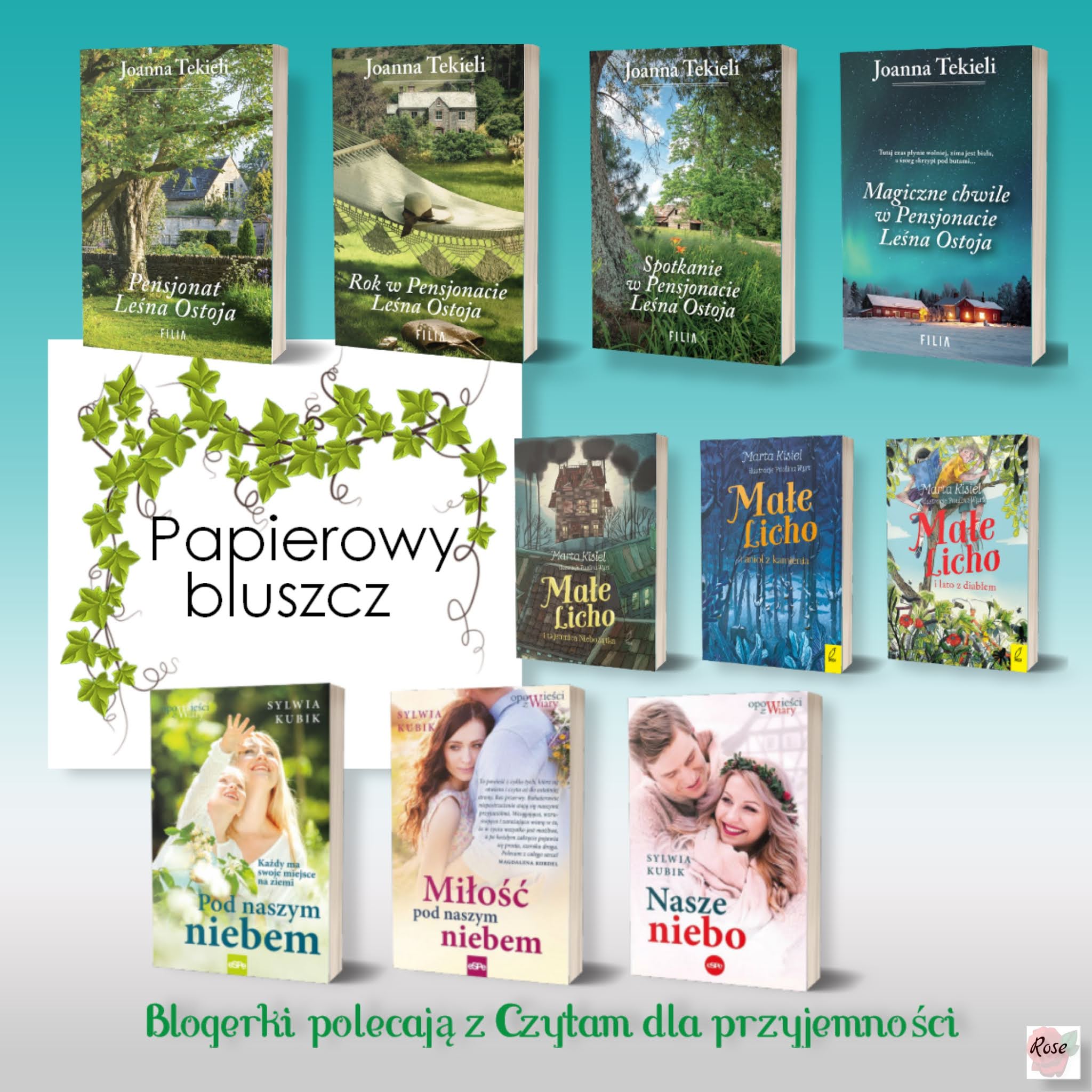 To była moja pierwsza myśl. Joanna Tekieli i jej cudowna seria o Pensjonacie Leśna Ostoja. A polecam Wam całość, ponieważ autorka ma szalenie lekkie i ciepłe pióro, idealne na ten czas. I świąteczny i pandemiczny – niestety. Jej bohaterowie są uroczy, każdy na swój niepowtarzalny sposób. Można się z nimi pośmiać i trochę pobać, odrobinę powzdychać i pokibicować… A tło wydarzeń? Oj, chcielibyście się znaleźć w tytułowym pensjonacie. 🙂