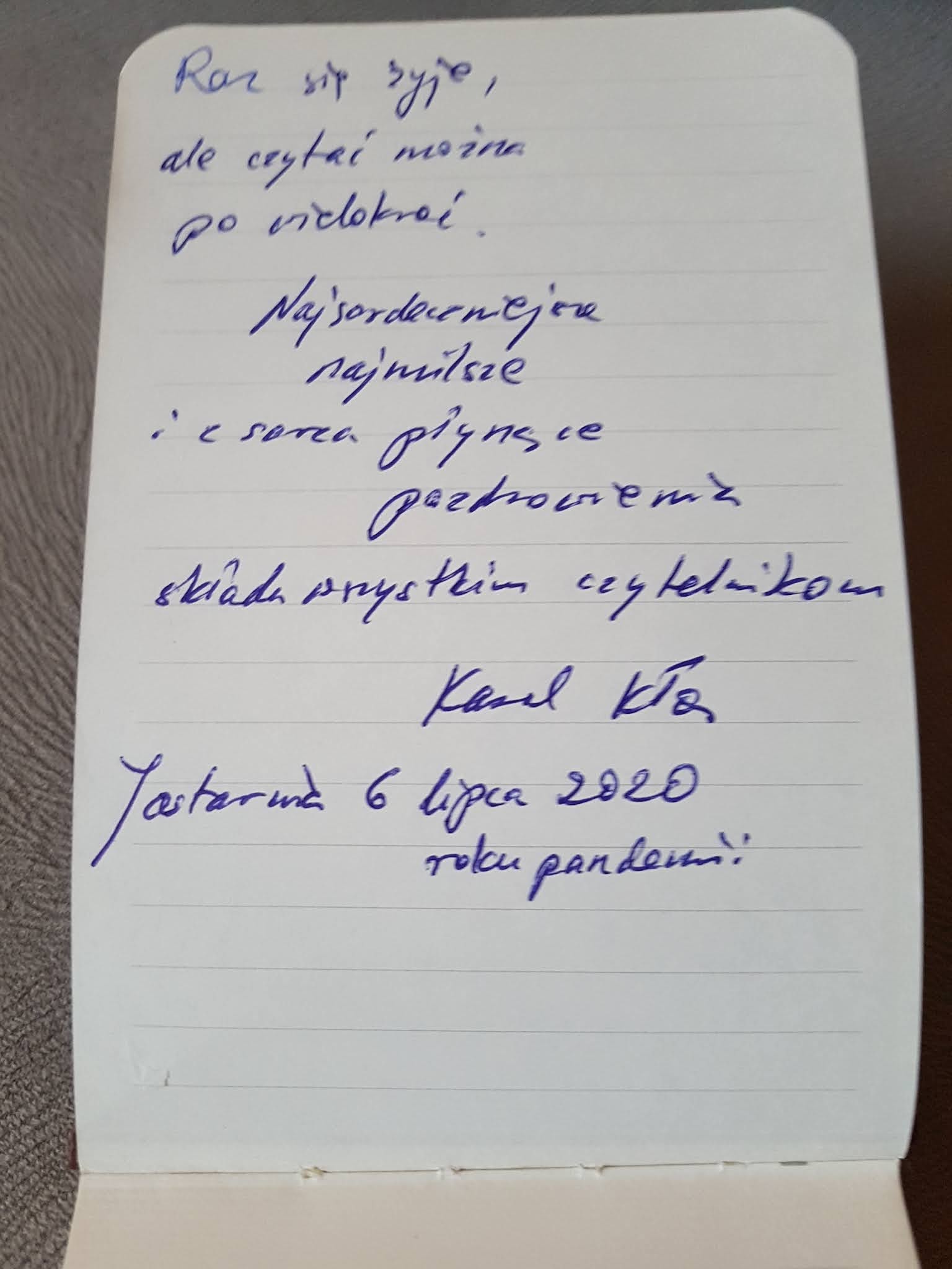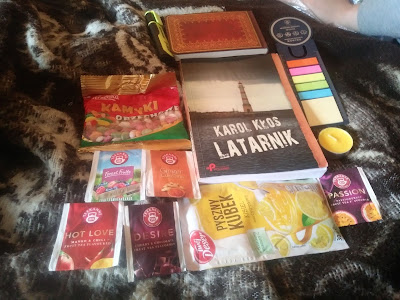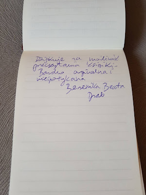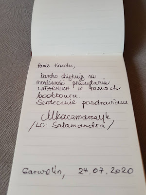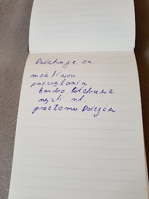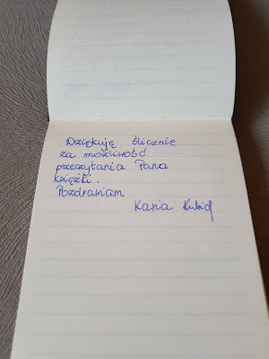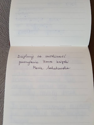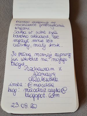 Poniżej zamieszczam zdjęcia, które wykonałam po otwarciu przesyłki. Tym razem uczestnicy nie zostawili komentarzy w książce, nie ma zaznaczonych fragmentów. Swoje wpisy uwiecznili w notesie, który został dołączony przez Autora.