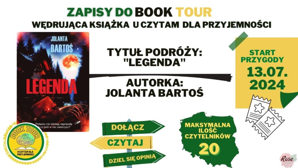 3. Prosimy by zdjęcie książki i link do recenzji został wysłany za pomocą messenger w grupie BT Legenda oraz zamieszczenie w recenzji informacji, że book tour jest organizowany przez Czytam dla przyjemności i Jolantę Bartoś.