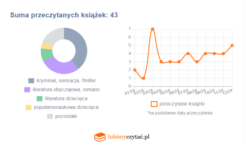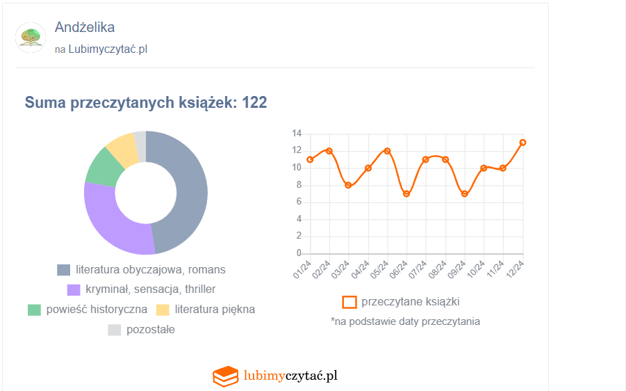W sumie przeczytałyśmy 177 książek. Poniżej znajdziecie kategorie według lubimy czytać, niestety nie wszystkie książki są na tym portalu. Do tego dochodzą bajki od Krzysia, których recenzja czasem pojawia się pod jednym numerem na blogu. Pozostajemy wierne literaturze obyczajowej, którą przeplatamy kryminałem czy powieściami historycznymi.