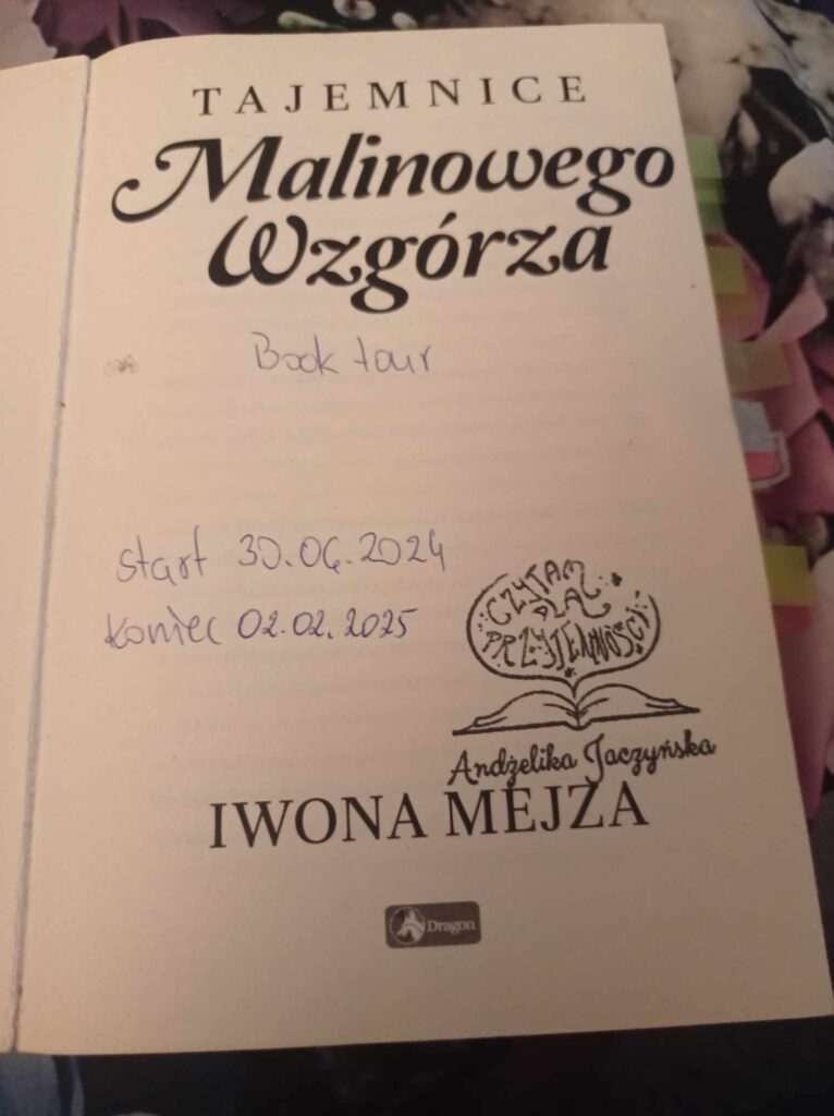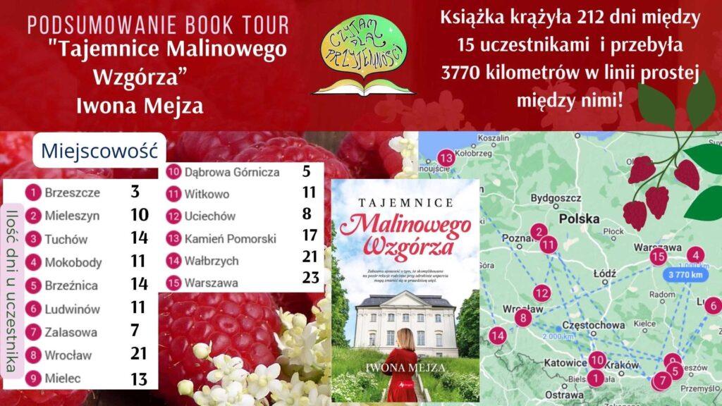 Książka “Tajemnice Malinowego Wzgórza ” Iwony Mejzy zakończyła swoją podróż po Polsce. Podczas podróży zebrała opinie i oceny, których średnia w book tour wyniosła 7,42. Uważamy, że powieść bardzo dobrze wypadła, a każda z uczestniczek znalazła coś dla siebie. Chociaż czują ogromny niedosyt, ponieważ brakło im wyjaśnienia tajemnic, o czym można przeczytać w ich opiniach. Pozostaje więc pytanie, czy będzie kontynuacja?