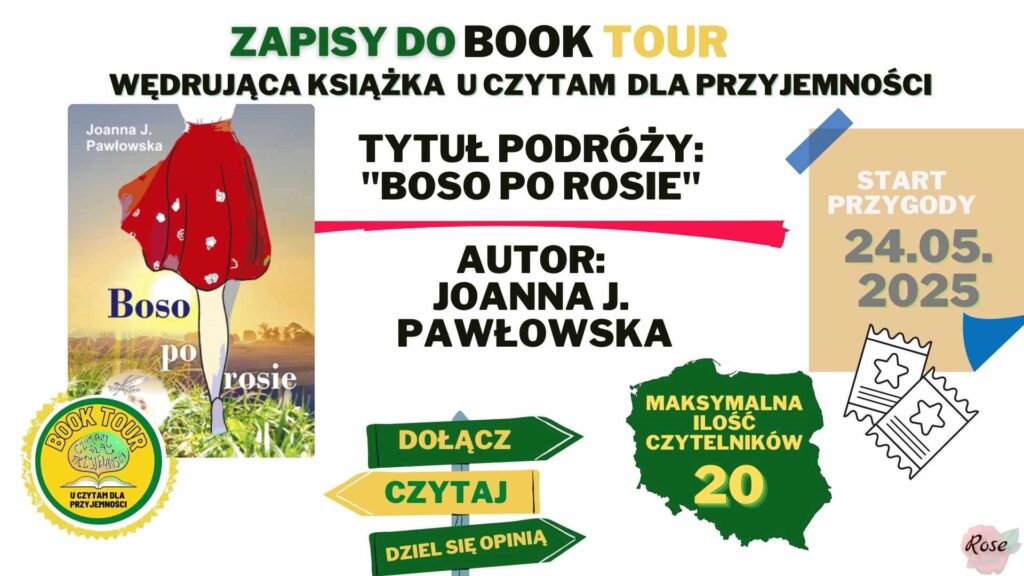 3. Prosimy by zdjęcie książki i link do recenzji został wysłany za pomocą messenger w grupie BT Boso po rosie oraz zamieszczenie w recenzji informacji, że book tour jest organizowany przez Czytam dla przyjemności i Autorkę.