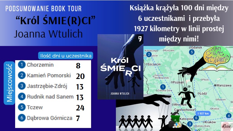 To był błyskawiczny book tour! Trwał tylko 100 dni! Wszystkie uczestniczki book tour zgodnie stwierdziły, że książka „Król śmierci” Joanny Wtulich jest ciekawą lekturą. Okładka na pierwszy rzut oka może wydawać się mroczna, lecz po przeczytaniu książki z całą pewnością można stwierdzić, że idealnie pasuje do fabuły. A tematy poruszone przez autorkę są bliskie każdemu z nas.