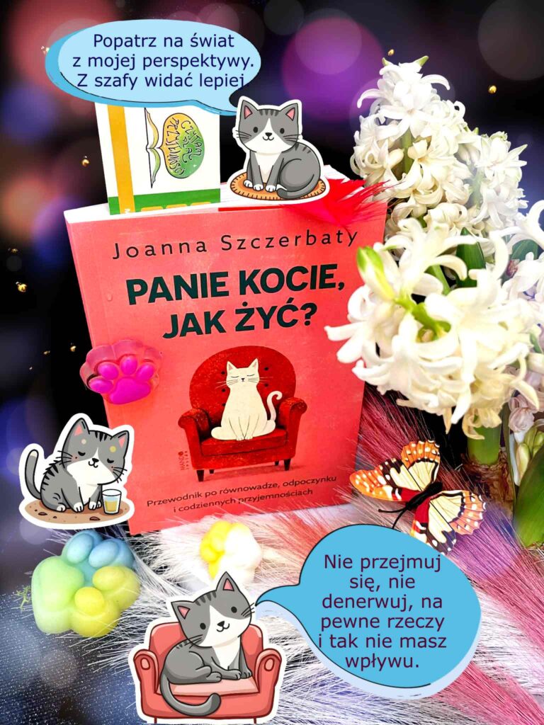 I tu z pomocą przychodzi nam Joanna Szczerbaty, która napisała poradnik „Panie kocie, jak żyć? Przewodnik po równowadze, odpoczynku i codziennych przyjemnościach”. W krótkich rozdziałach autorka opisuje sytuacje z naszego codziennego życia, które każdy z nas bardzo bardzo dobrze zna, ale nie zastanawia się nad przyczynami. Dlatego warto usiąść na chwilę i sprawdzić co dostrzega Pan Kot ze wspomnianej książki. A wnioski są bardzo proste. Nauczmy się cieszyć i dbajmy o siebie. Jeżeli czegoś nie zrobimy osobiście, lecz delegujemy zadanie na kogoś innego, to świat nie zawali się. Może nie będzie to zrobione tak jak sami byśmy to zrobili, ale zyskaliśmy czas, który możemy poświęcić sobie i swoim przyjemnościom. Przestańmy się „karmić” złymi emocjami i odrzućmy złość, zazdrość. Postarajmy się dobrze mówić o innych, albo tak jakbyśmy chcieli by o nas mówiono. Plotki i obmawianie nie służy niczemu dobremu.